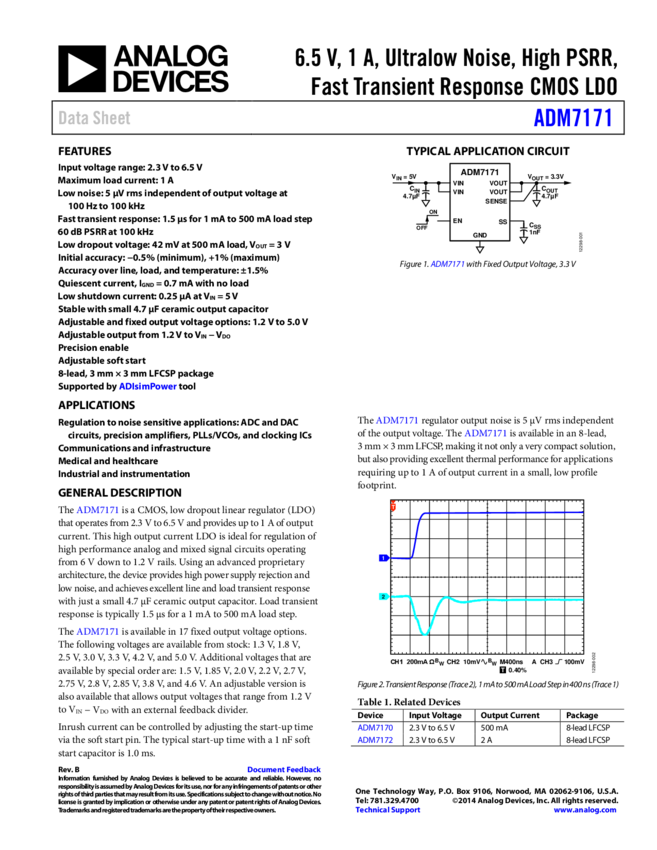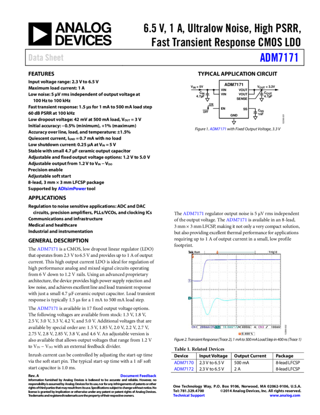ADM7171: 6.5 V, 1 A, Ultralow Noise, High PSRR, Fast Transient Response CMOS LDO