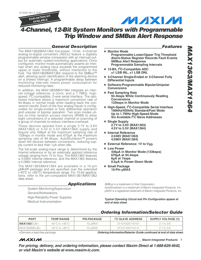 MAX1364 4-Channel, 10-bit, System Monitors with Programmable Trip Windows and SMBus Alert Response