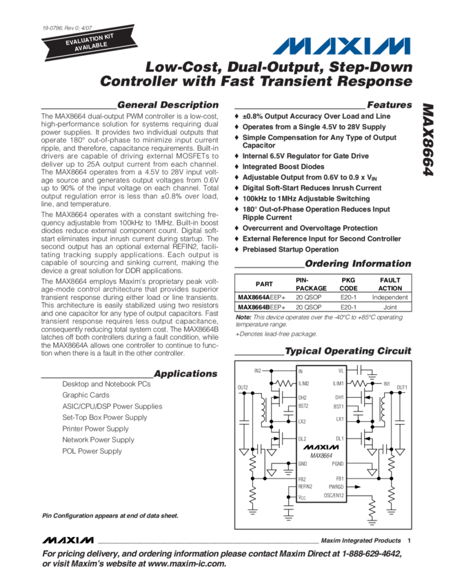 MAX8664 Low-Cost, Dual-Output, Step-Down Controller with Fast Transient Response
