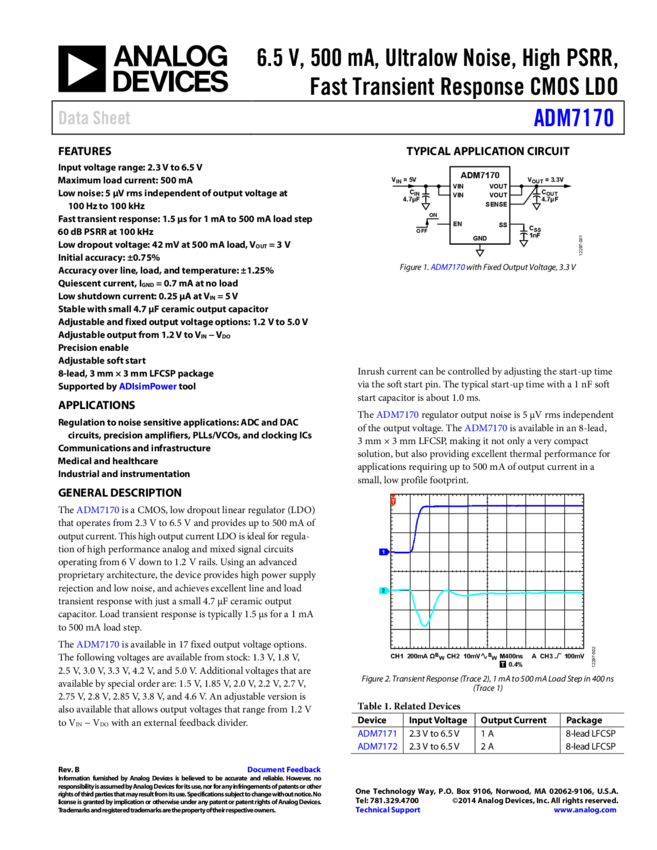 ADM7170: 6.5 V, 500 A, Ultralow Noise, High PSRR, Fast Transient Response CMOS LDO