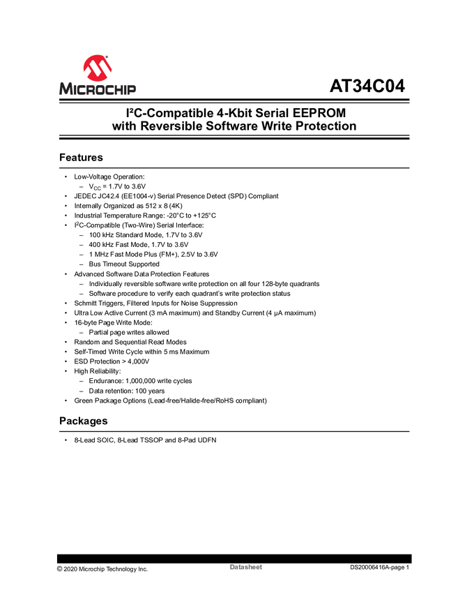 AT34C04 I²C-Compatible 4-Kbit Serial EEPROM with Reversible Software Write Protection