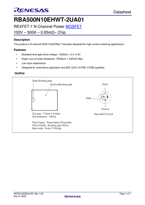 REXFET-1 N-Channel Power MOSFET 100V – 500A – 0.65mΩ – Chip