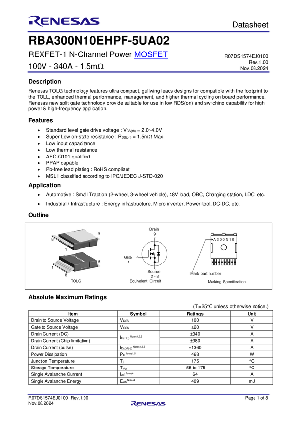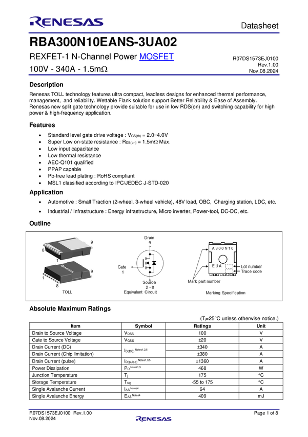 100V, 340A, 1.5mΩ, REXFET-1 N-Channel Power MOSFET in TOLL