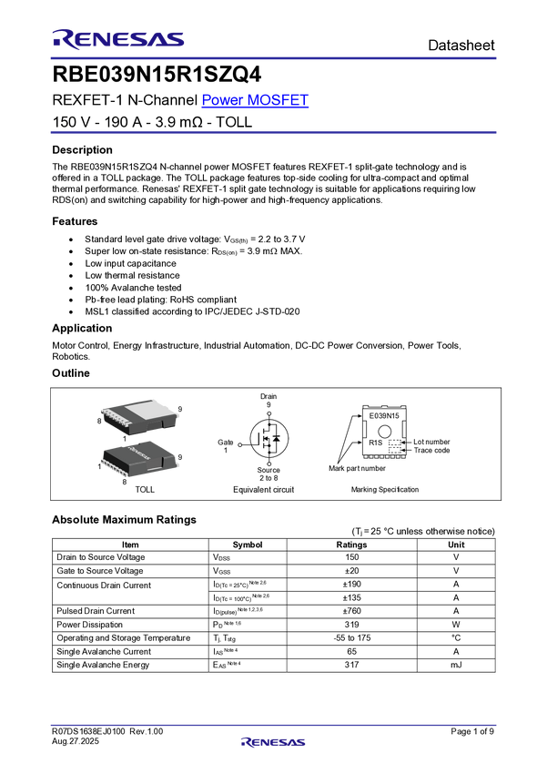 150V, 190A, 3.9mΩ, REXFET-1 N-Channel Power MOSFET in TOLL