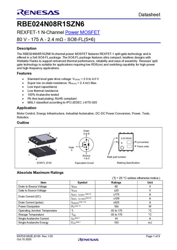 80V, 175A, 2.4mΩ, REXFET-1 N-Channel Power MOSFET in SO8-FL (5x6)