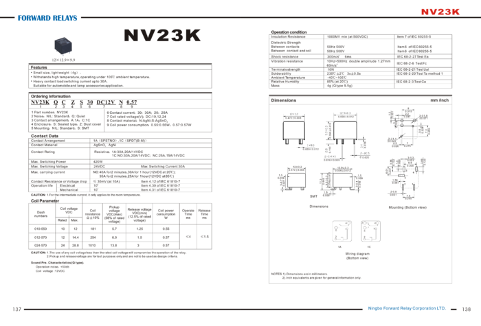 Mało-gabarytowy przekaźnik , ze stykiem przełącznym ( 2C ), napięcie cewki , rezystancja cewki 1028Ω, 0.14W