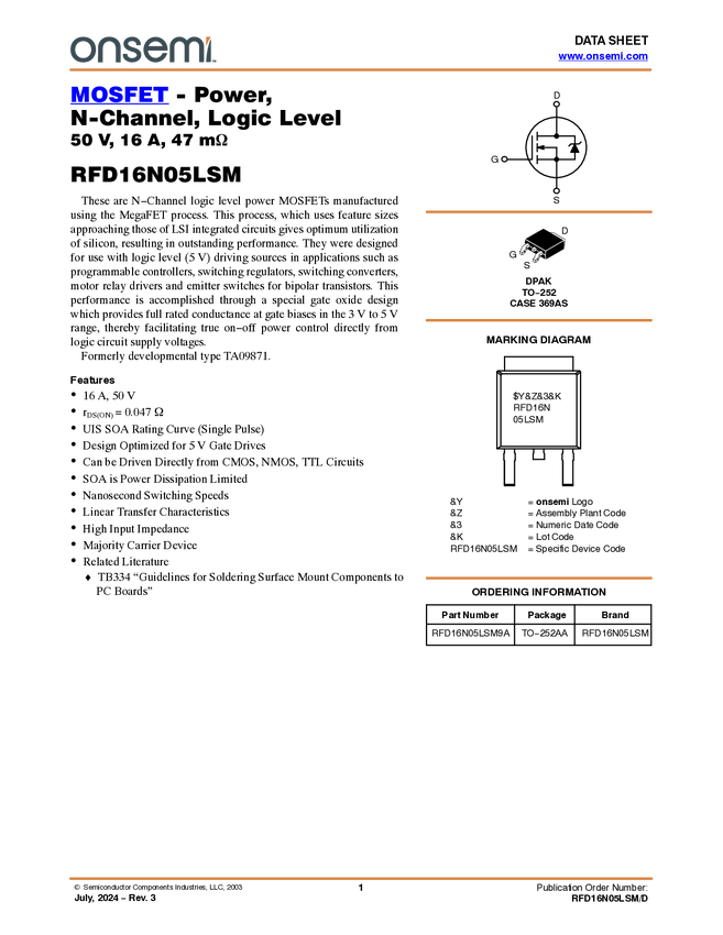 N-Channel Logic Level Power MOSFET 50V, 16A, 47mΩ