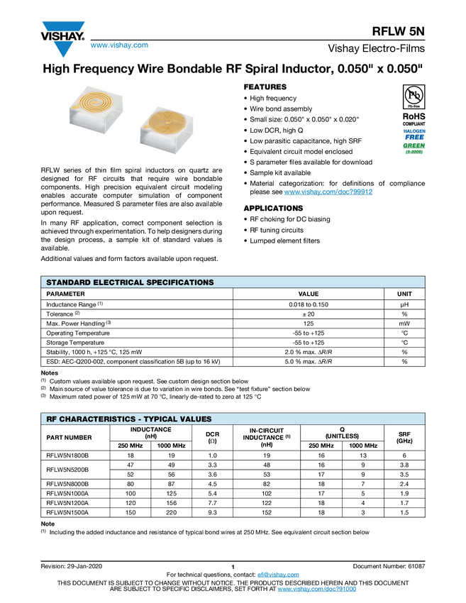High Frequency Wire Bondable RF Spiral Inductor, 0.050" x 0.050"