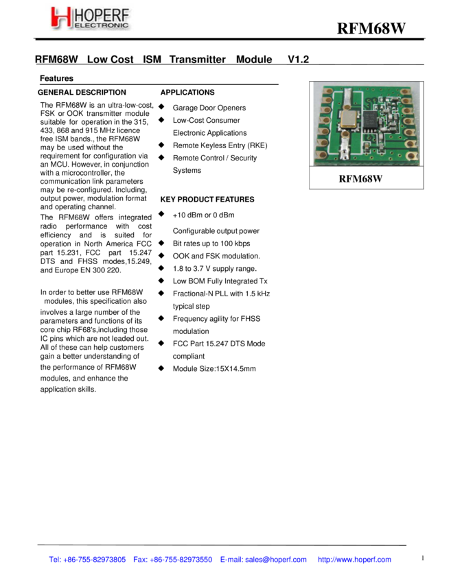 Nadajnik RF 433 MHz FSK, SMD, moc 10 dBm, 16 x 16 mm, kompatybilny pin-pin z nadajnikiem RFM02-433