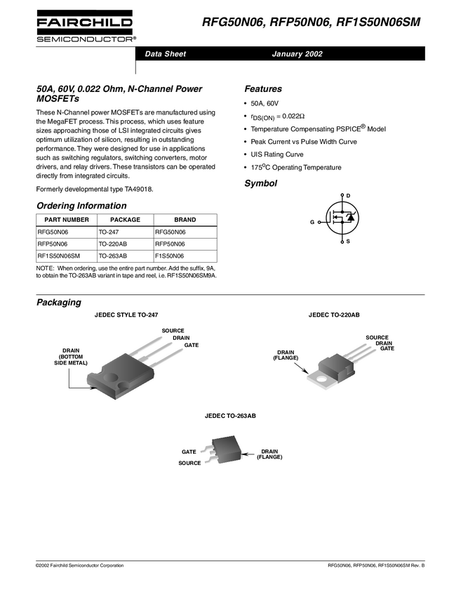 Tranzystor; N-MOSFET; 50A; 60V; 131W; 22mOhm; unipolarny; TO220; THT; FAIRCHILD SEMICONDUCTOR; RFP50N06; RoHS
