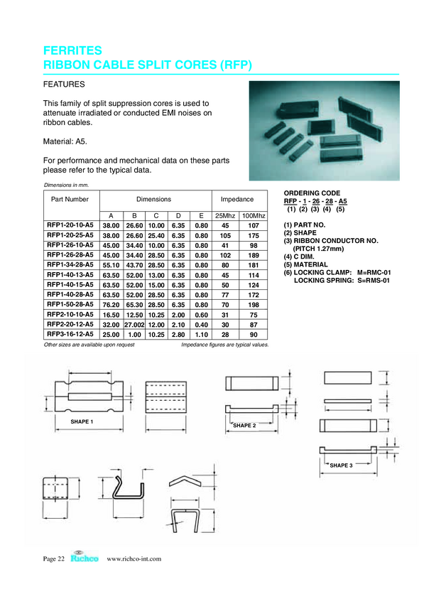 Rdzeń ferrytowy, płaski Richco RFP1-20-25-A5, 175 Ω, (D x S x W) 38 x 25.4 x 12.7 mm, 1 szt.
