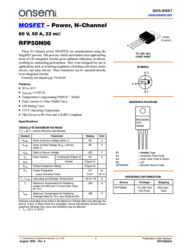 N-Channel Power MOSFET 60V, 50A, 22mΩ