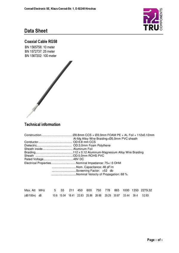 Kabel koncentryczny TRU COMPONENTS 1572737, Średnica zewnętrzna: 5 mm, RG58, 75 Ω, 52 dB, czarny, 25 m