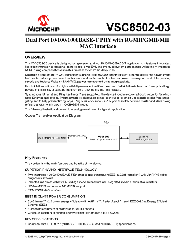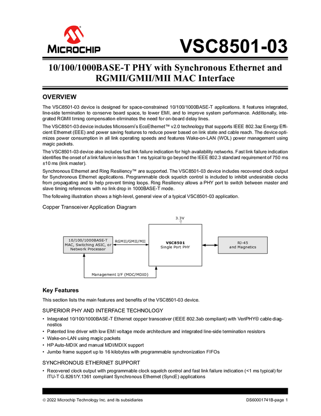 VSC8501-03 10/100/1000BASE-T PHY with Synchronous Ethernet and RGMII/GMII/MII MAC Interface Datasheet