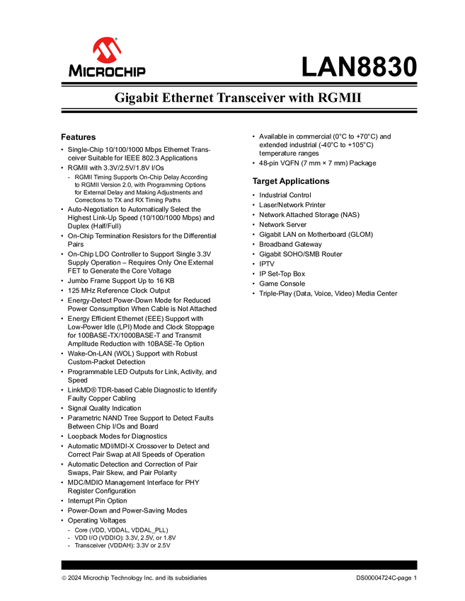 LAN8830 Gigabit Ethernet Transceiver with RGMII Data Sheet