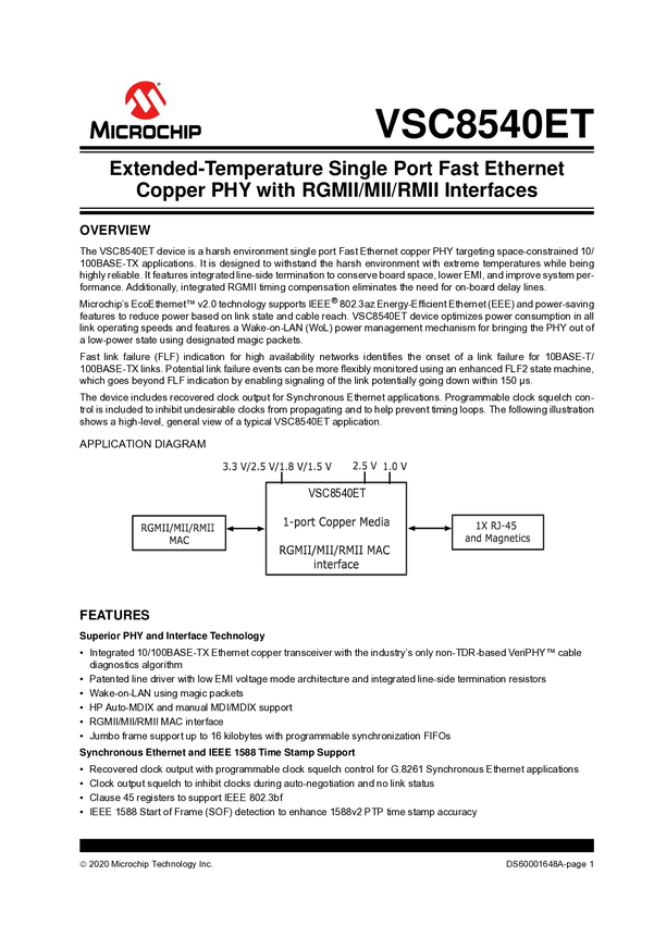 VSC8540ET Single Port Fast Ethernet Copper PHY with RGMII/MII/RMII Interfaces