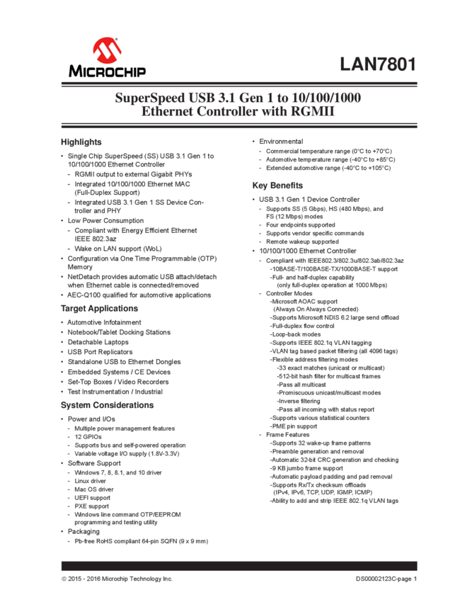 LAN7801 SuperSpeed USB 3.1 Gen 1 to 10/100/1000 Ethernet Controller with RGMII