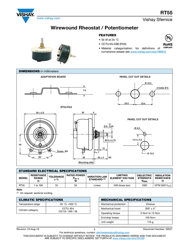 Toroidal rheostat & potentiometer PRE10 rez.2,2 kohm 10W;IP 42; I=0,1A; średnica 76mm gł. 47mm, ośka 6mm dł. 45mm; tol.3%; lin 1% 150ppm, mocowanie 2xM4; p/n 017410622002