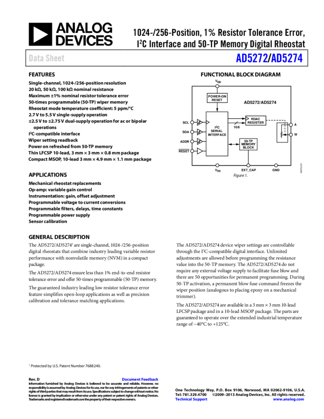 AD5274: 256-Position, 1% Resistor Tolerance Error, IC Interface and 50-TP Memory Digital Rheostat
