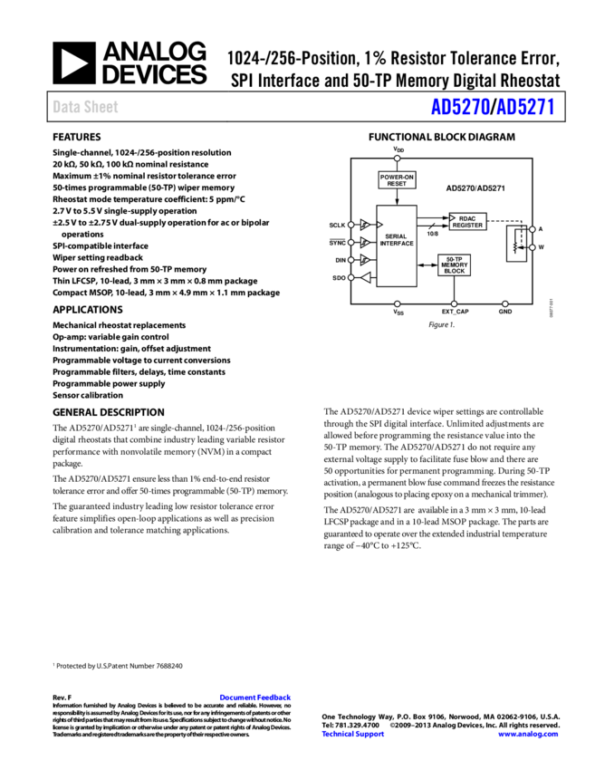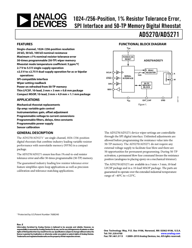 AD5271: 256-Position, 1% Resistor Tolerance Error, SPI Interface and 50-TP Memory Digital Rheostat