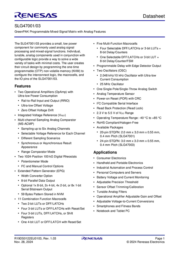 AnalogPAK Programmable Mixed-Signal IC with Extended Temperature Range, VDD Range: 2.3-5.5V, 11 GPIOs, 1 ACMPs, 2 Op Amps, 2 Rheostats, I2C