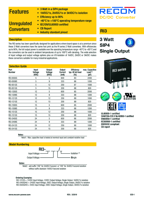 RECOM RI3-1212S Przetwornica DC/DC RI3-1212S, 3 W, 12 V, 250 mA, 1 szt.