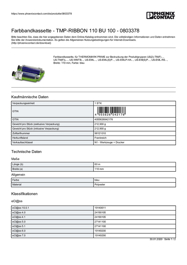 Phoenix Contact 0803378 TMP-RIBBON 110 BU 100 Kaseta z kolorową taśma do Thermomark Prime niebieski 1 szt.