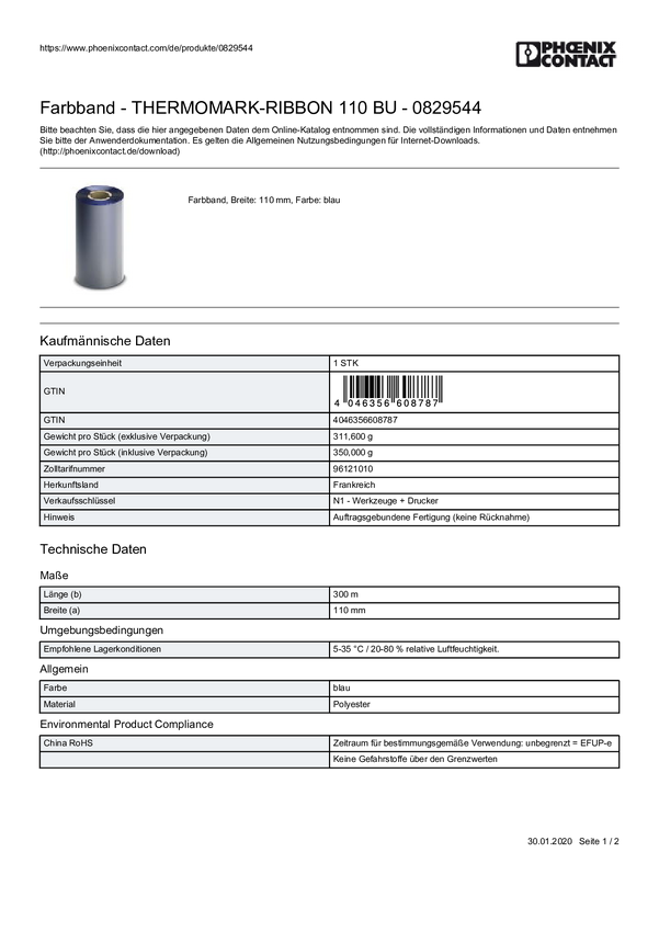 Taśma kolorowa do drukarki termotransferowej Phoenix Contact THERMOMARK-RIBBON 110 BU 0829544, 1 szt.
