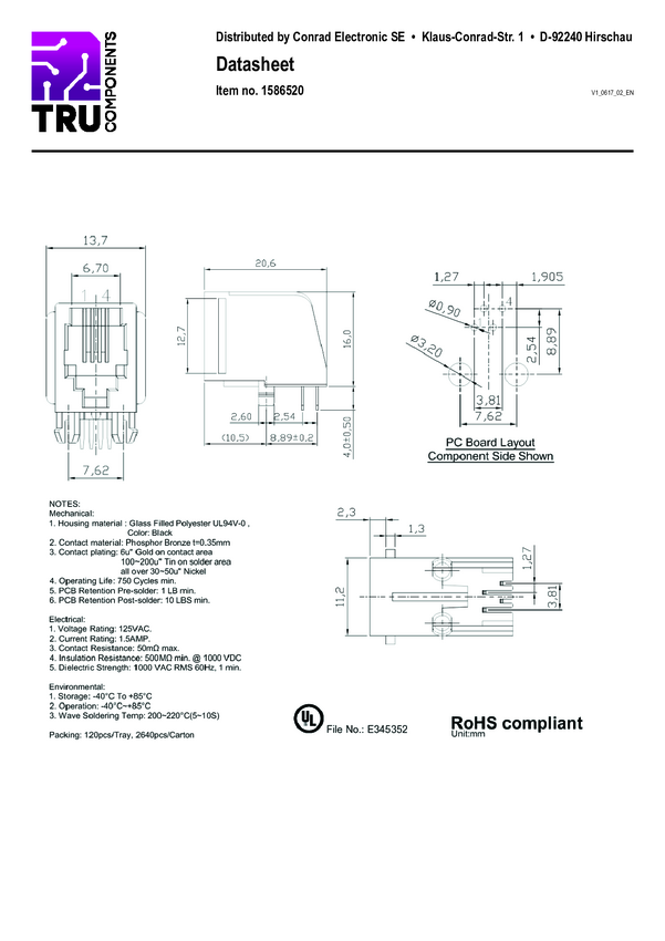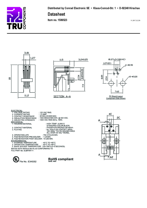 TRU COMPONENTS 7712844 Złącze RJ Western, RJ10, CAT 3, CAT 5, piny:4P4C, 1 szt.