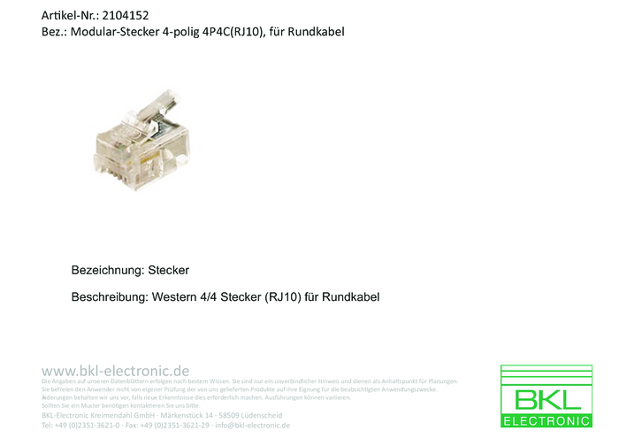 BKL Electronic 142141 Złącze RJ, RJ10, piny:4P4C, 1 szt.