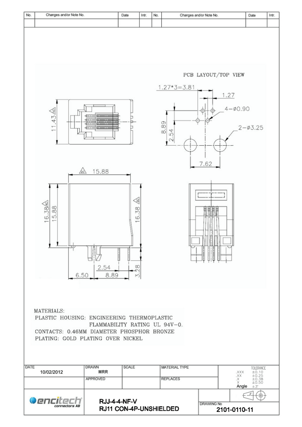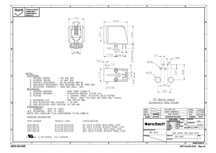 encitech RJJU-44-143-E7V-011 złącze żeńskie do wbudowania poziomego RJ10 encitech RJJU-44-143-E7V-011 3257-0011-03 złącz