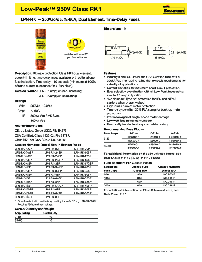 Fuse Class RK1 35A 250V Slow Blow 2-Pin Cartridge Holder Carton