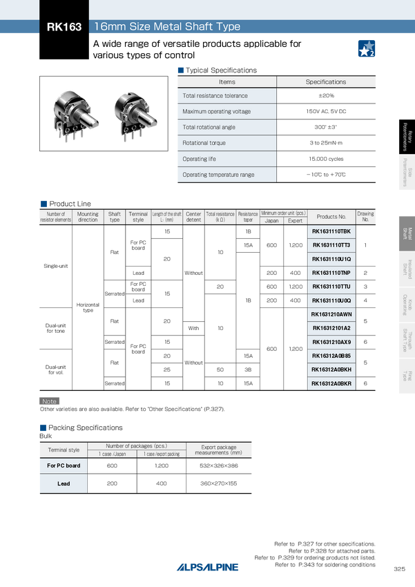 Potencjometr 16 mm, tol 20%; prod.rez. 500-1M B-liniowy 0,2W; A-log 0,1W; el.260st; mech 300st, trwałość 100.000 cykli; ośka okr.lub ścięta lub knurled - podobny do Alpsa RK163