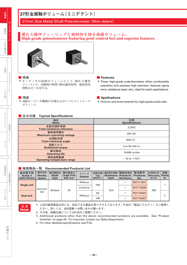 Potencjometr audiofilski Blue-Alps bushing M8x0,75, 300 st szer.27 wys 24,5 gł. 25,3mm 15.000 cykli; stereo (podwójny) ośka okrągła 6mm dł. 20mm,zapadka na środku, charakterystyka specjalna MN (logarytmiczna ) nadruk 100KMN; 810G Charakterystyka MN - używana najczęściej do balansu pierwszy pot.-150-0 stopni 0 ohm 0-150 stopni rośnie log. do 100K drugi pot. -150-0 stopni rośnie log.od 0-100K 0-150 100k