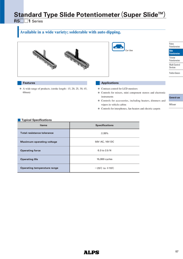 Potencjometr suwakowy 10 kohm, charakterystyka A-logarytmicz na;mono-pojedyńczy; Travel 30mm; wym 45 x 8 x 7 mm; śruby 41 mm; wodzik metalowy 20 mm typ 4 L1=20mm; potencjometr sprowa dzany na zamówienie - minimum 10 sztuk RS3011110k