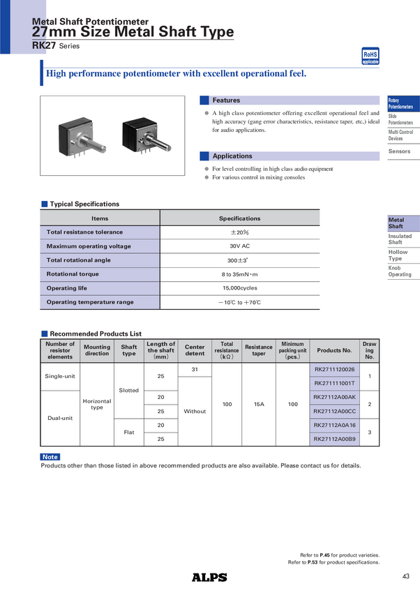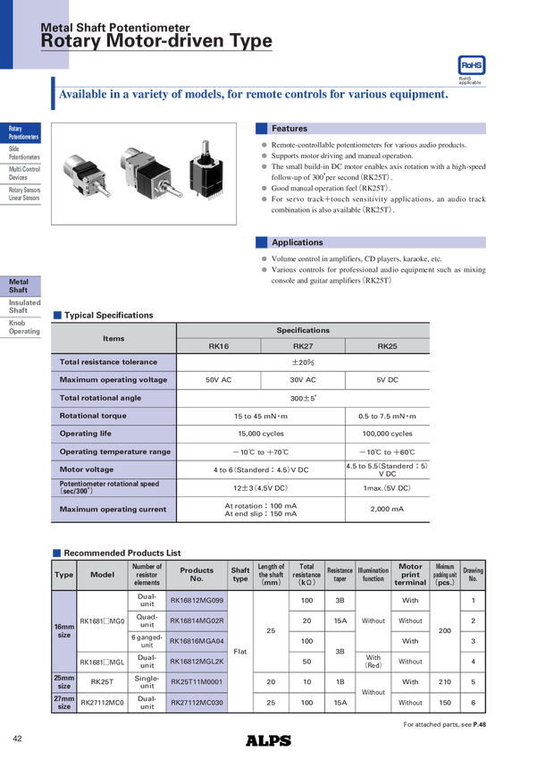 Potencjometr z silniczkiem ALPS RK27112MC 10KBX2 lin 10 kOhm Max. 30 V/AC