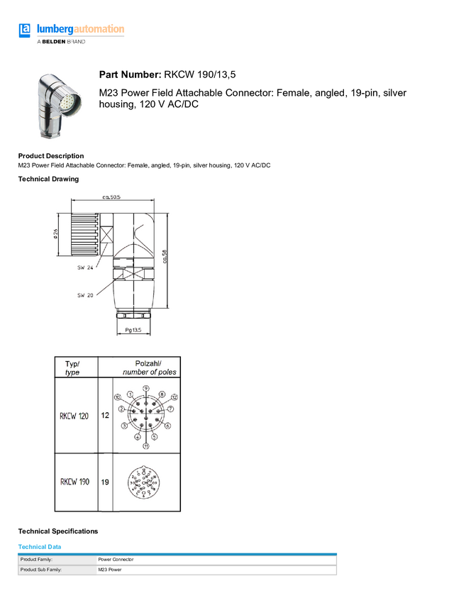 Złącze niekonfekcjonowane czujnika/aktuatora Lumberg Automation RKCW 190/13,5 2207-SR, piny: 19, 1 szt.