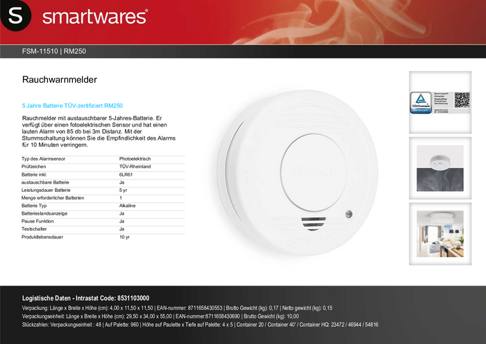 Smartwares RM250 Czujnik dymu zaw. baterię na 5 lat pracy bateryjne (Ø x W) 100 mm x 35 mm