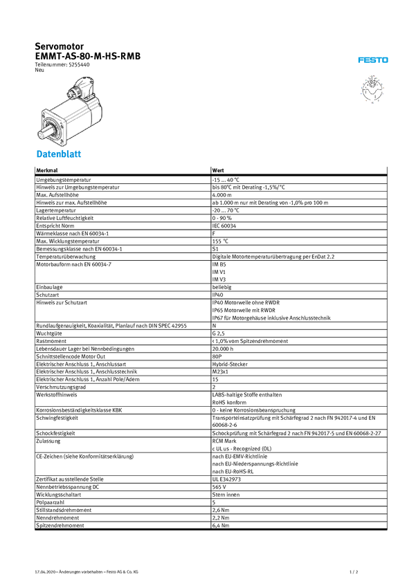 Silnik serwo FESTO EMMT-AS-80-L-HS-RMB 5255448, 3.5 A, 17.5 A
