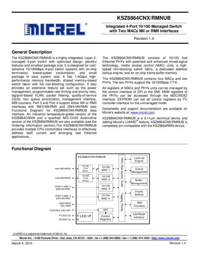 KSZ8864CNX_RMNUB Integrated 4-Port 10/100 Mgd Switch with 2 MACs MII or RMII Int (11/05/2015)