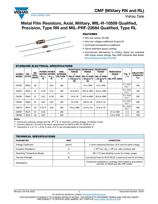 Metal Film Resistors, Axial, Military, MIL-R-10509 Qualified, Precision, Type RN and MIL-PRF-22684 Qualified, Type RL