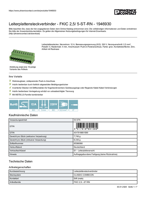 Phoenix Contact 1946930 Obudowa złącza pin męskiego na kabel FKIC 2,5/ 5-ST-RN, piny: 5, 12 A, 50 szt.
