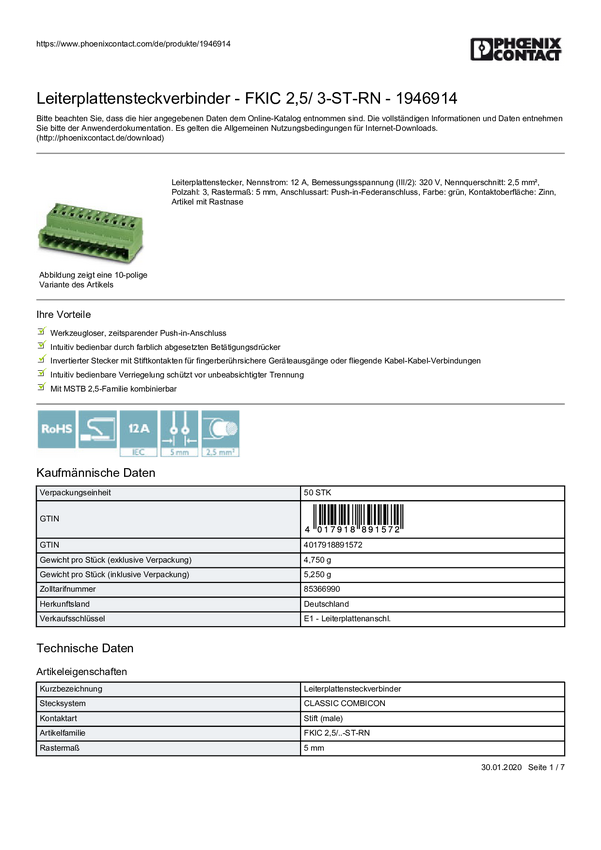 Phoenix Contact 1946914 Obudowa złącza pin męskiego na kabel FKIC 2,5/ 3-ST-RN, piny: 3, 12 A, 50 szt.