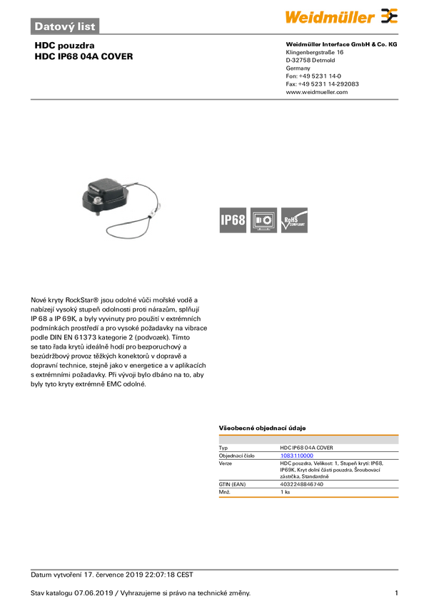 Weidmüller HDC IP68 04A COVER 1083110000 obudowa HDC, Wielkość konstrukcyjna: 1, Stopień ochrony: IP 68, Pokrywa do górn