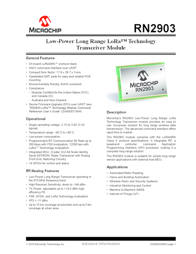 RN2903 LoRa Technology Transceiver Module Data Sheet (12/18/2015)