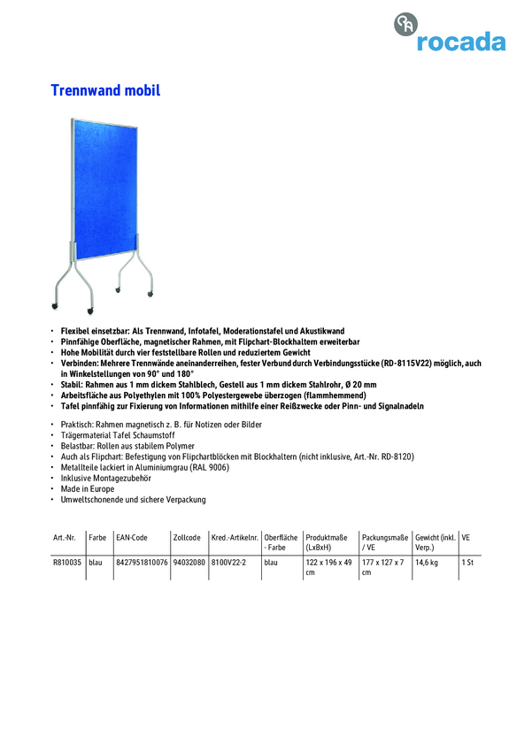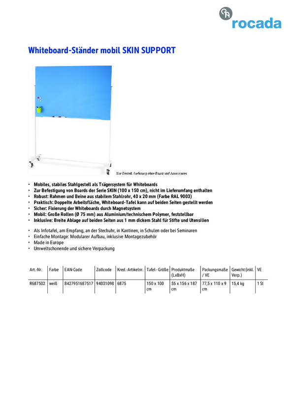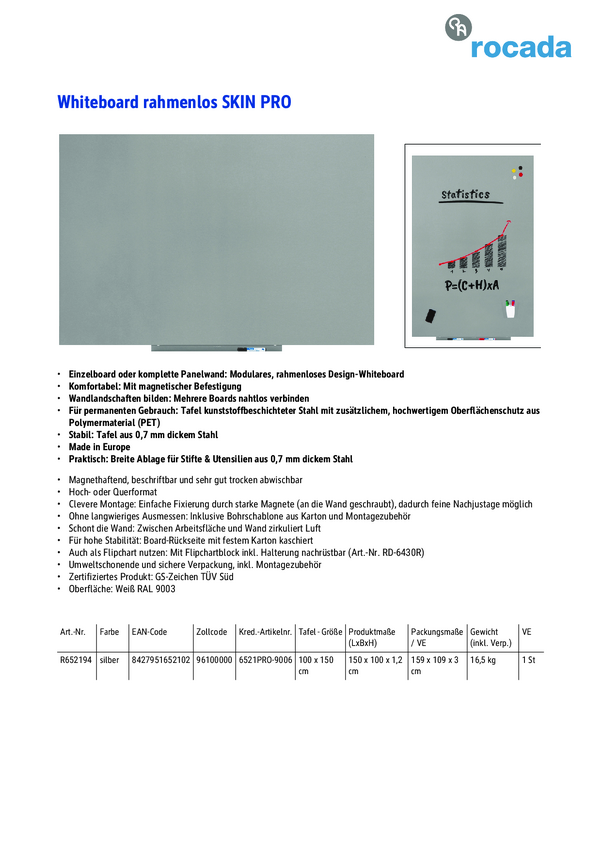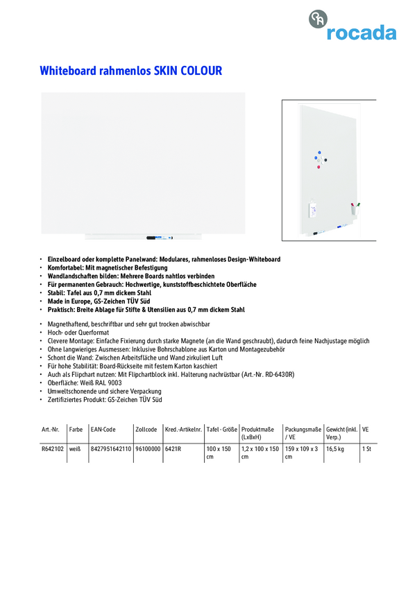 Tablica suchościeralna Rocada 6421R (S x W) 150 cm x 100 cm