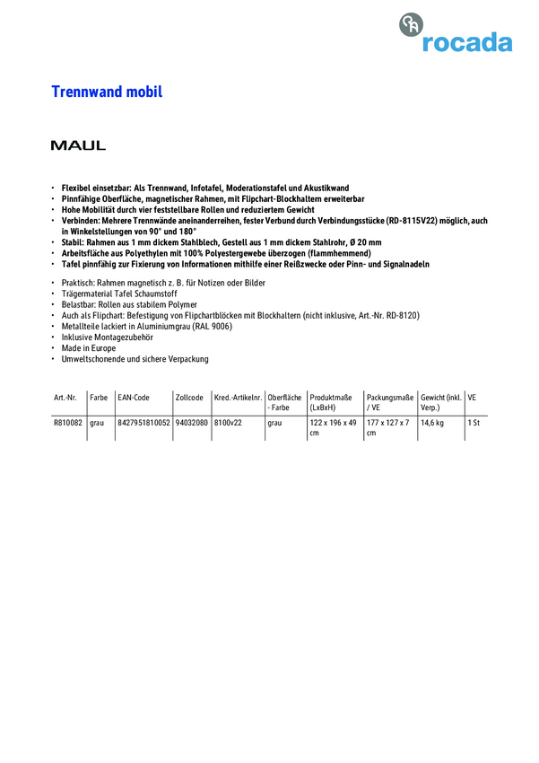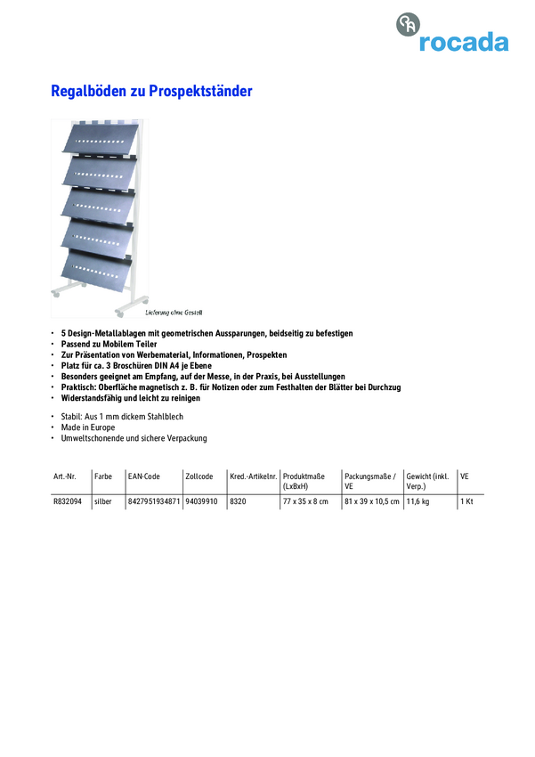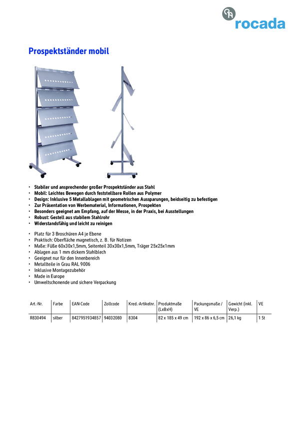 Rocada 8304 R830494 Uchwyt do prospektów szary Ilość przegródek 5 1 szt. (S x W x G) 820 x 1850 x 490 mm