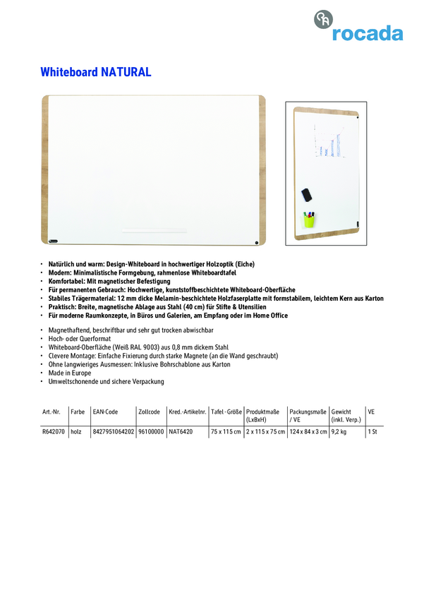 Tablica suchościeralna Rocada NAT6420 (S x W) 115 cm x 75 cm