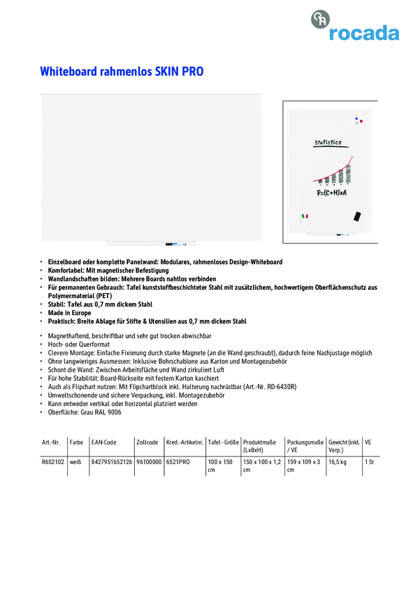 Tablica suchościeralna Rocada 6521PRO (S x W) 100 cm x 150 cm