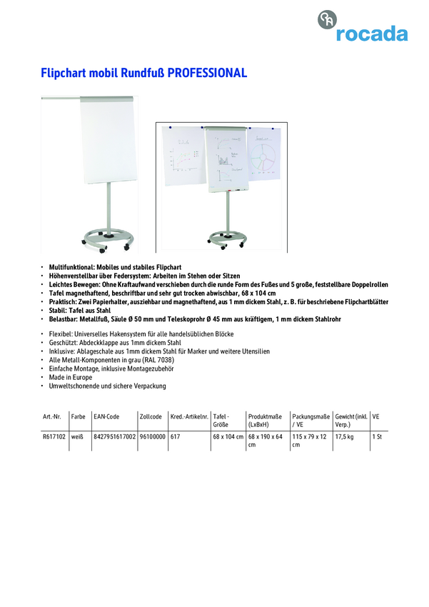 Flipchart Rocada 617 (S x W) 1900 mm x 640 mm biały, szary